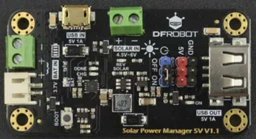 The DFRobot Solar Power Manager 5V is a compact and efficient solar power management module designed to regulate and manage solar energy. It provides a stable 5V output, making it ideal for powering low-power devices and charging lithium-ion or lithium-polymer batteries. This module is specifically engineered to maximize the efficiency of solar energy harvesting while ensuring safe and reliable operation.