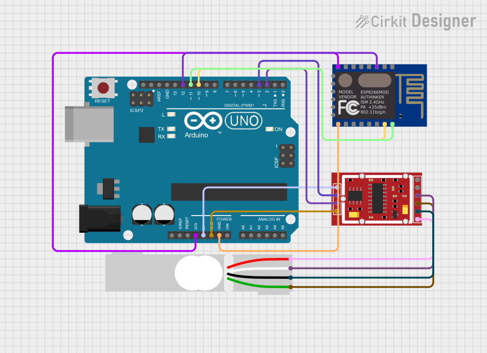 This circuit integrates an Arduino UNO microcontroller with an HX711 Weighing Sensor Module and an ESP8266 ESP-12E WiFi Module to create a smart weighing system. The system measures the weight of an object using a Load Cell and communicates the data wirelessly via the ESP8266 module. The Arduino UNO is used to process the data from the HX711 module and control the data flow to the ESP8266 for wireless transmission.