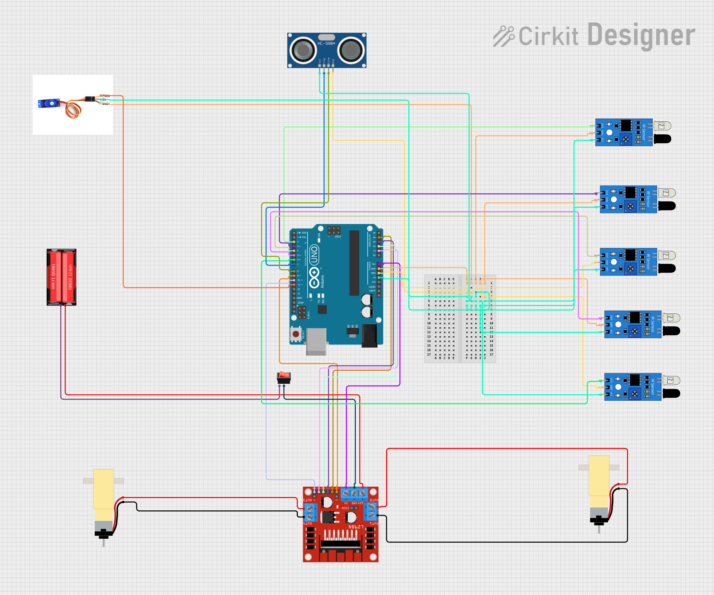 This circuit is designed to interface an Arduino UNO with various sensors and actuators, including IR sensors, an ultrasonic sensor (HC-SR04), a DC motor driver (L298N), hobby gearmotors, a servo motor (SG90), a rocker switch, and a Li-Ion battery (18650). The Arduino UNO controls the motors through the motor driver, reads distance measurements from the ultrasonic sensor, and detects object presence with IR sensors. The servo motor is controlled directly by the Arduino. Power management is handled through the battery, motor driver, and a rocker switch.